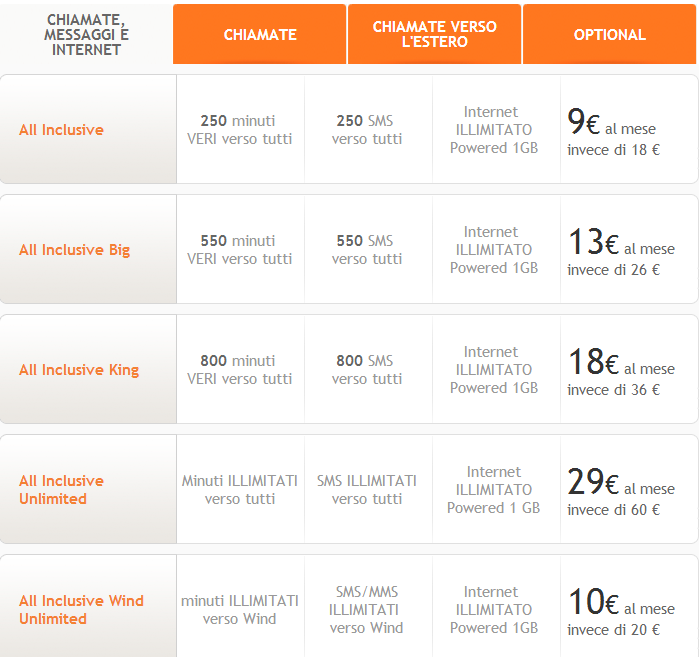 Ricordiamo che il prezzo in grassetto è aperto a tutti, anche ai già clienti Wind, che possono attivare le offerta ad un prezzo scontato ad un costo una tantum di 15 euro.